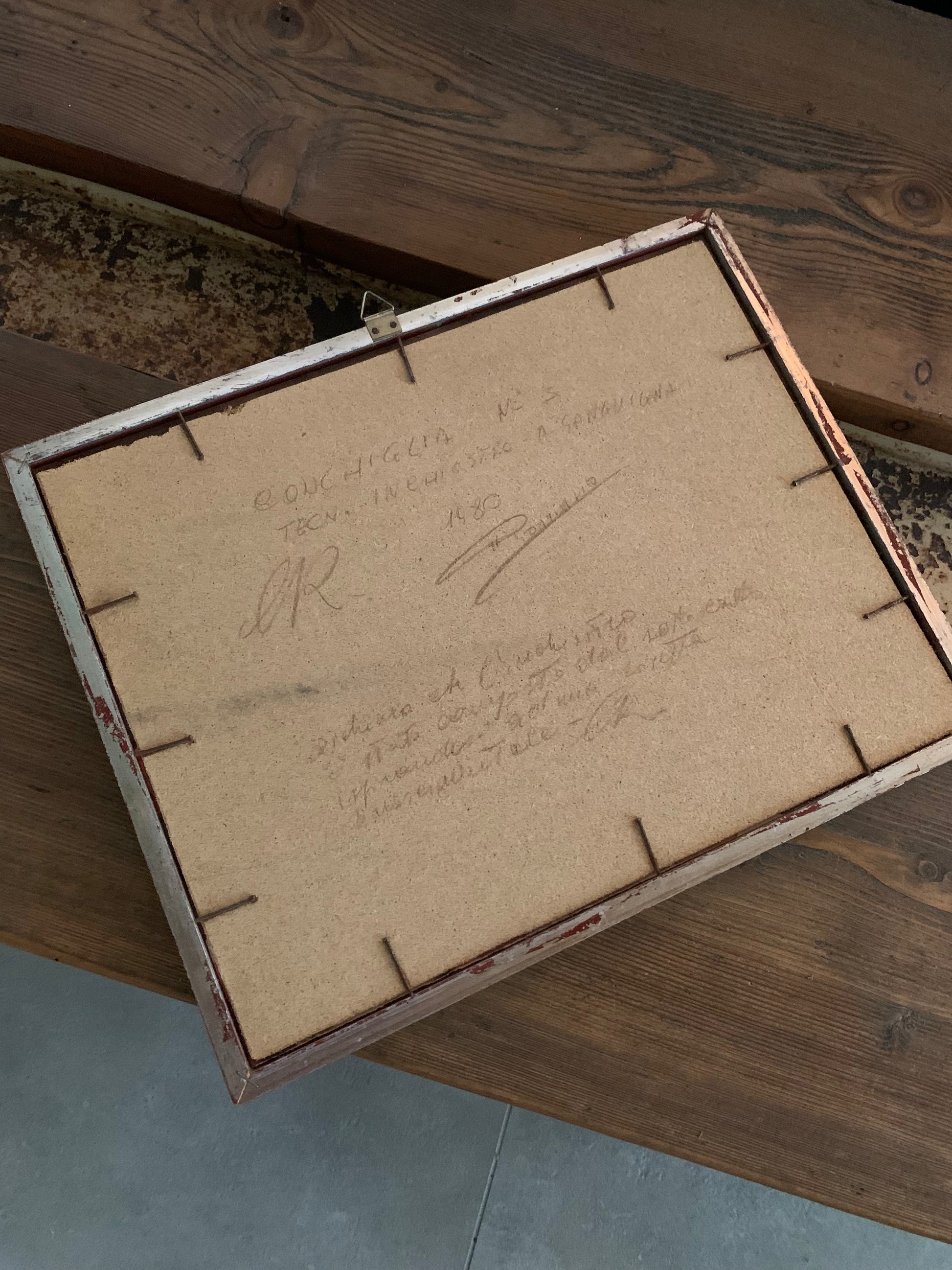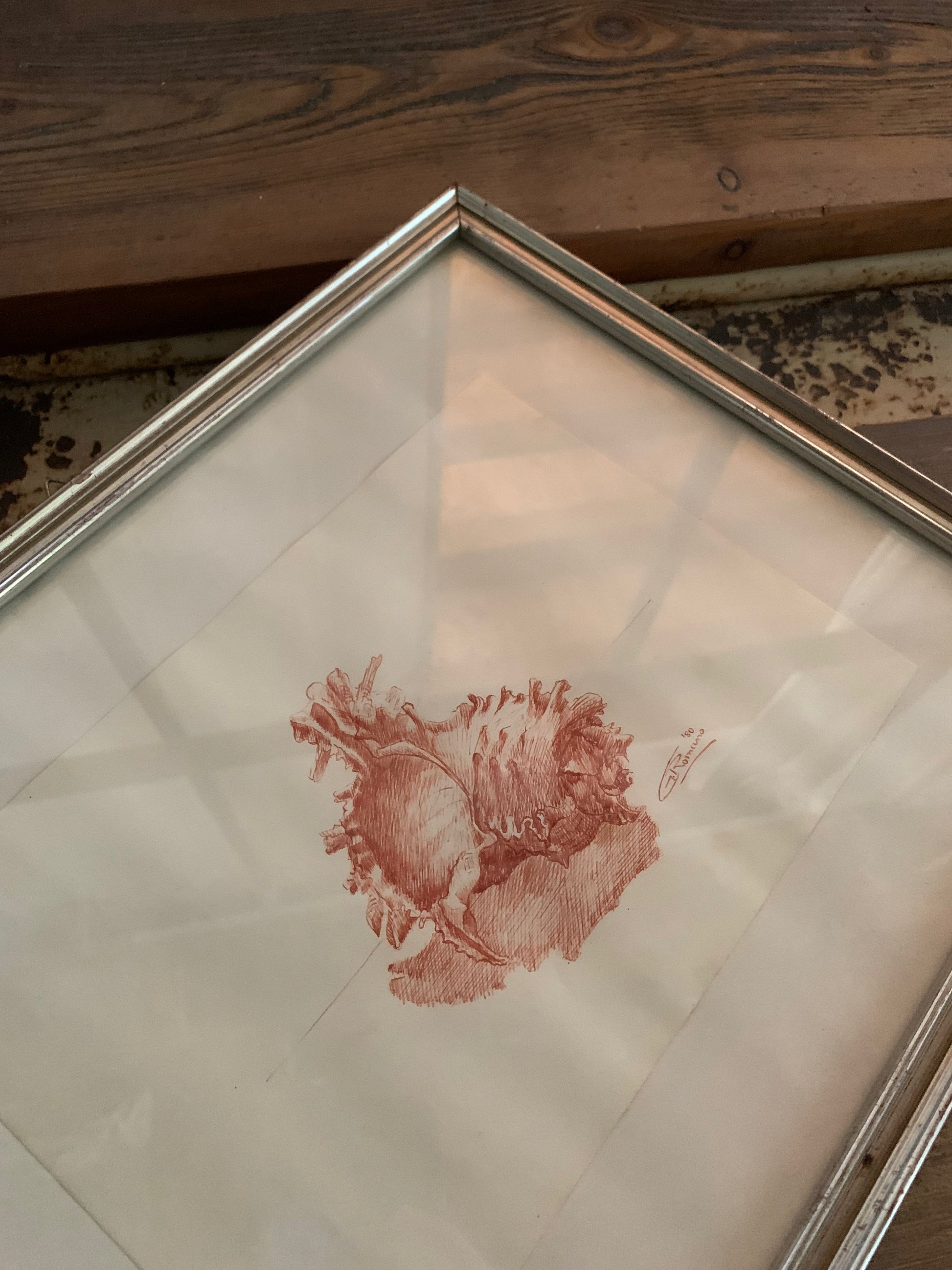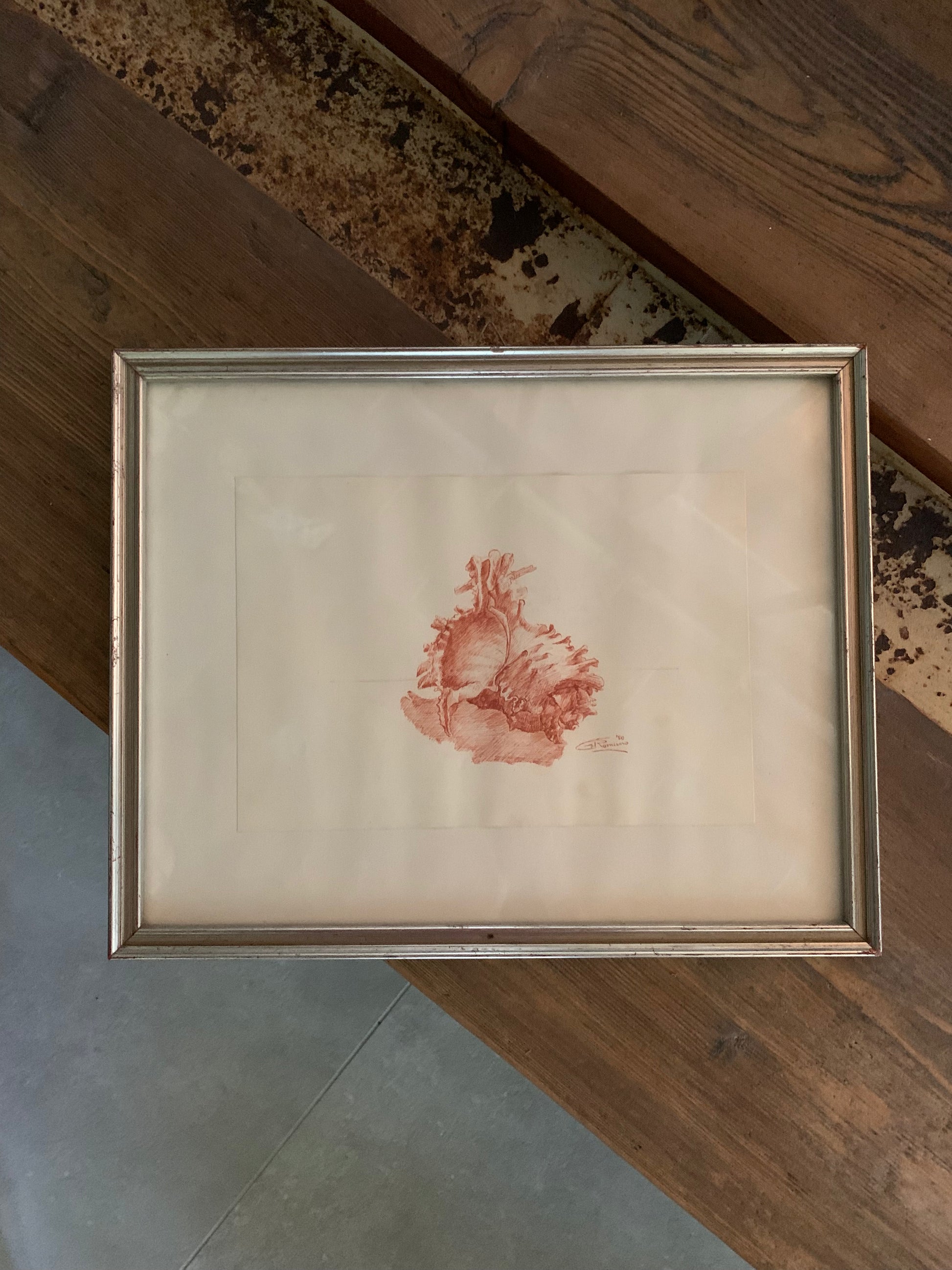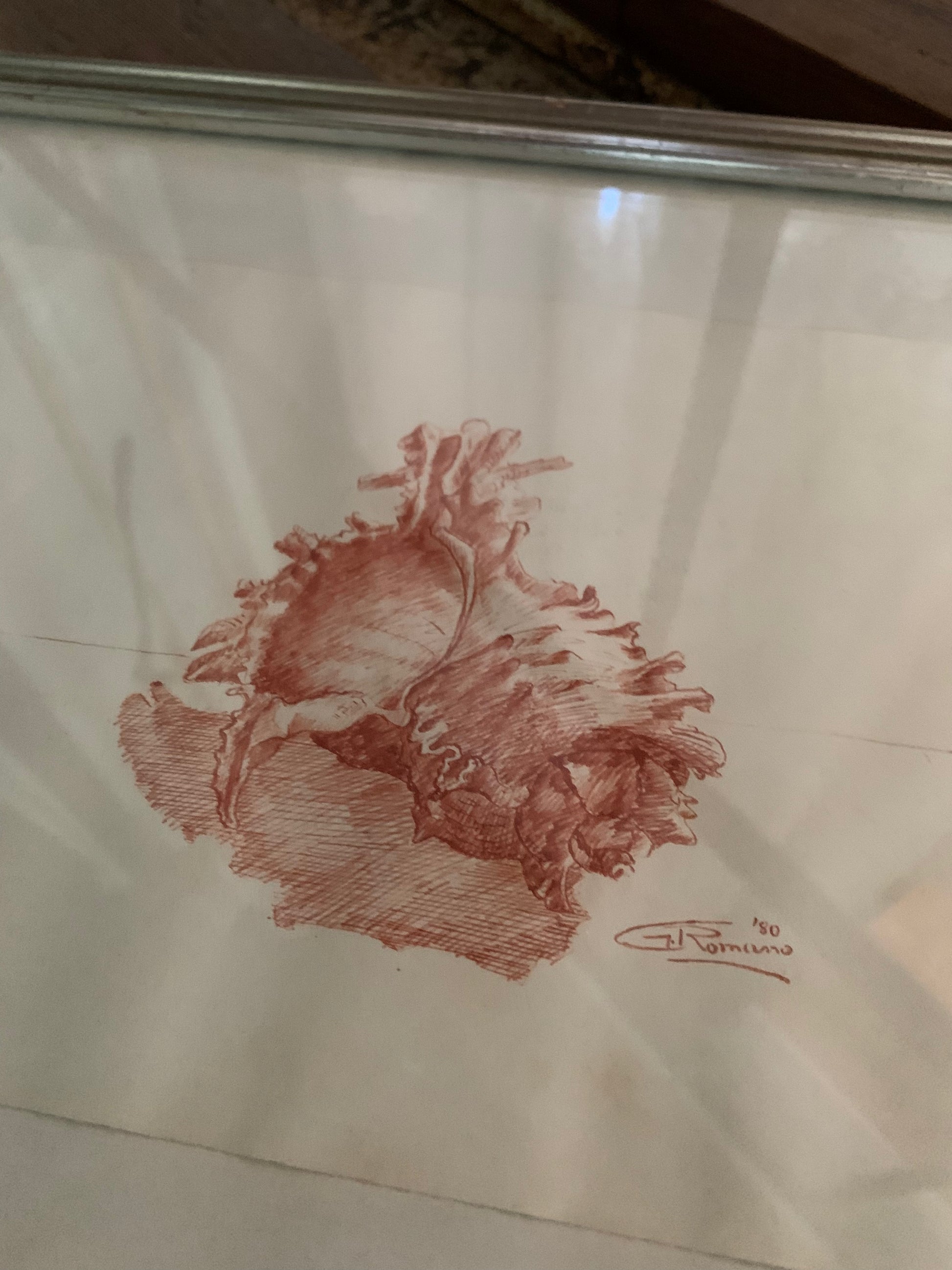 Original drawing dated 1980, executed in sanguigna (red chalk) on paper, depicting a stylized shell with fine tonal shading and contour detail.