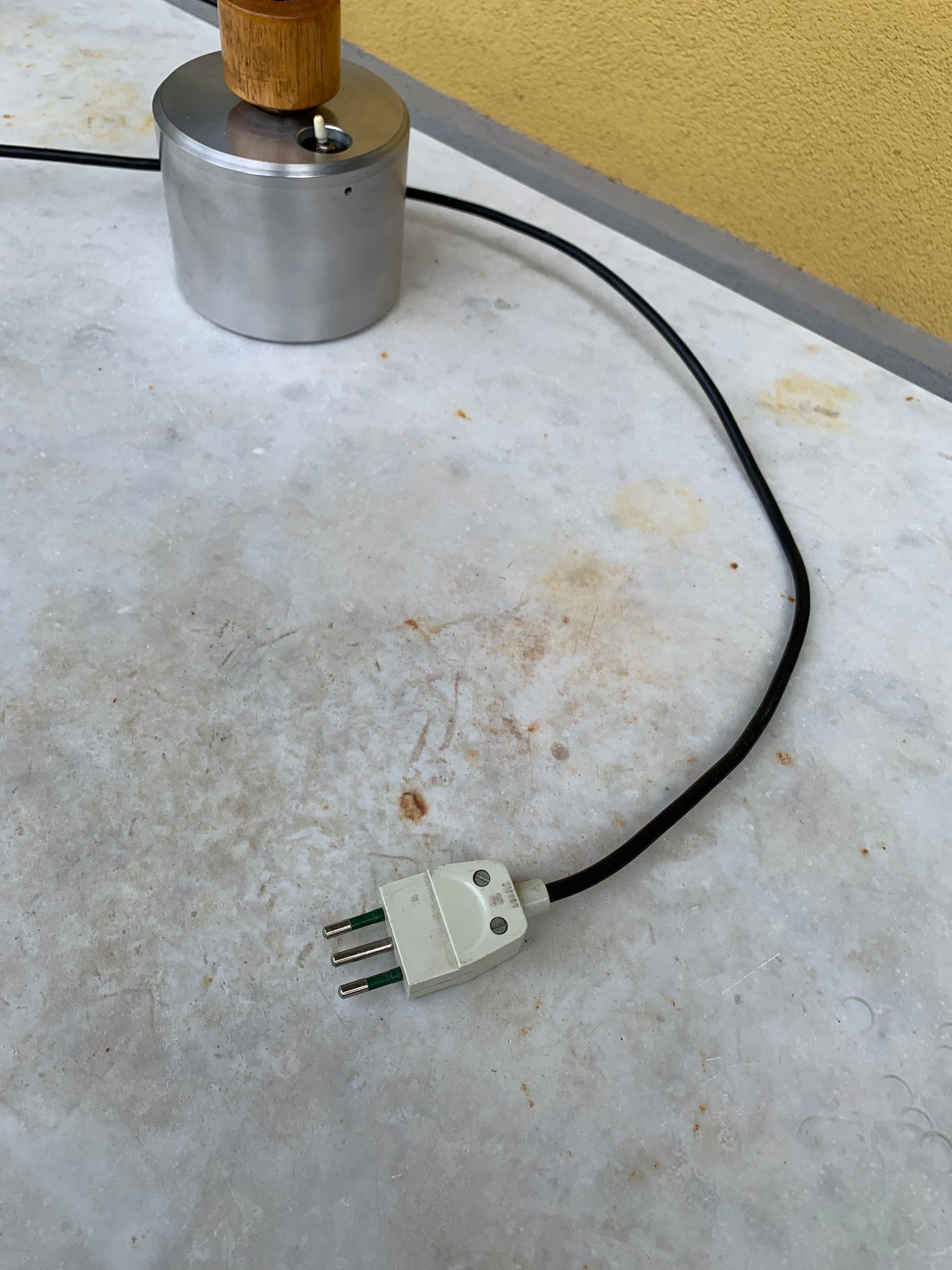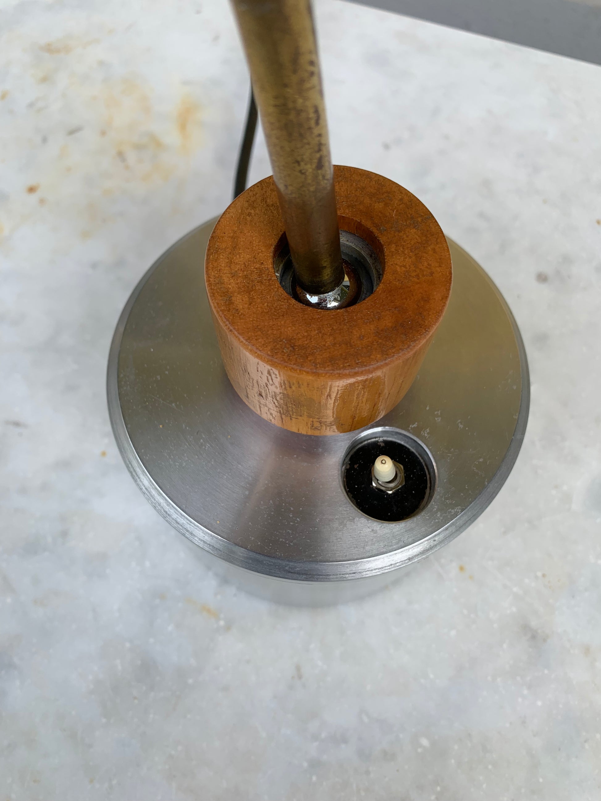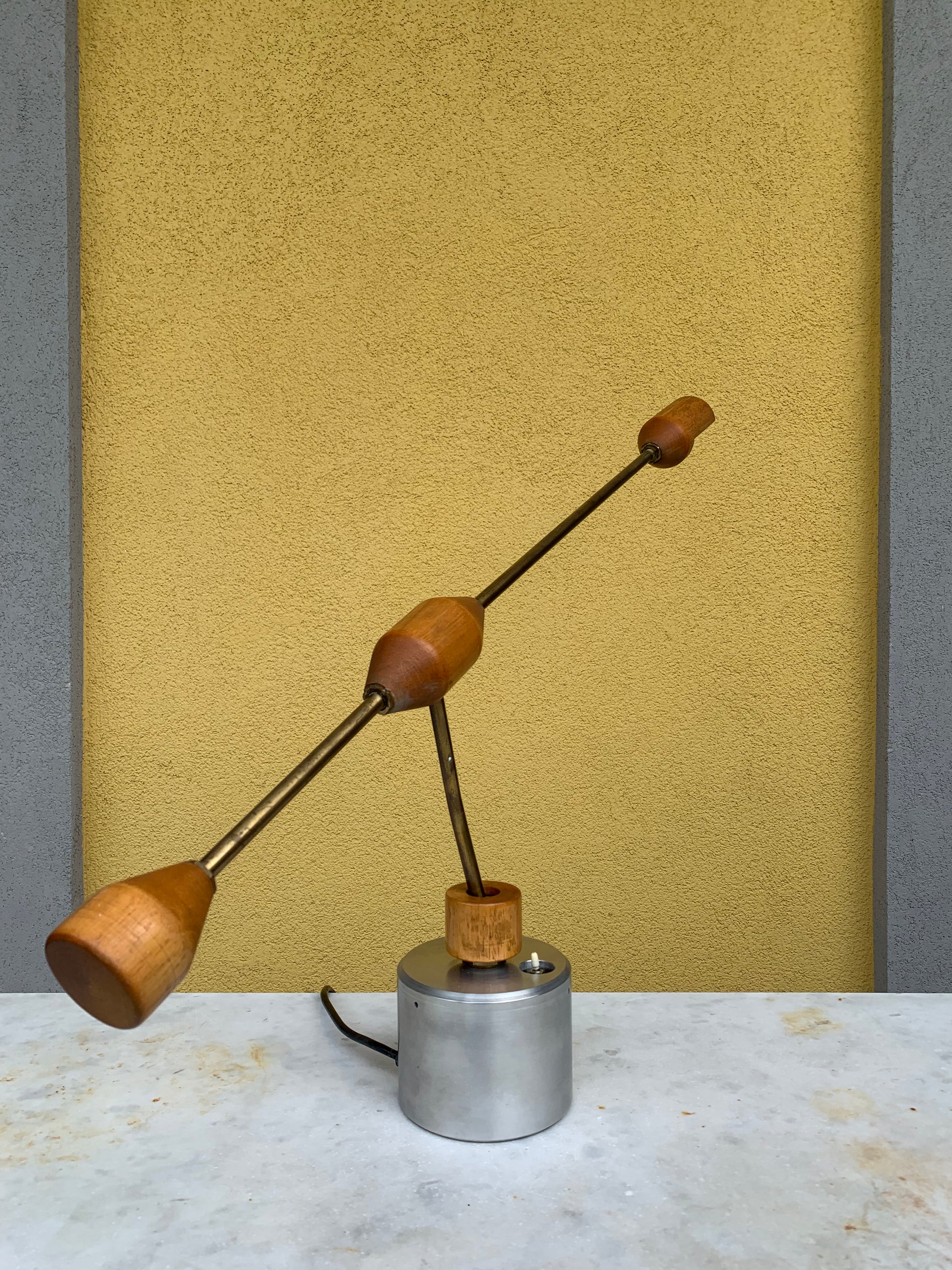 Vintage 1950s adjustable designer lamp featuring a wooden lampshade and articulated joints, supported by a base in brushed aluminium with a brass arm. The lamp is fitted with a G5.3 ceramic lamp holder and an integrated on/off switch. Both the lamp and shade are fully adjustable, allowing versatile positioning.