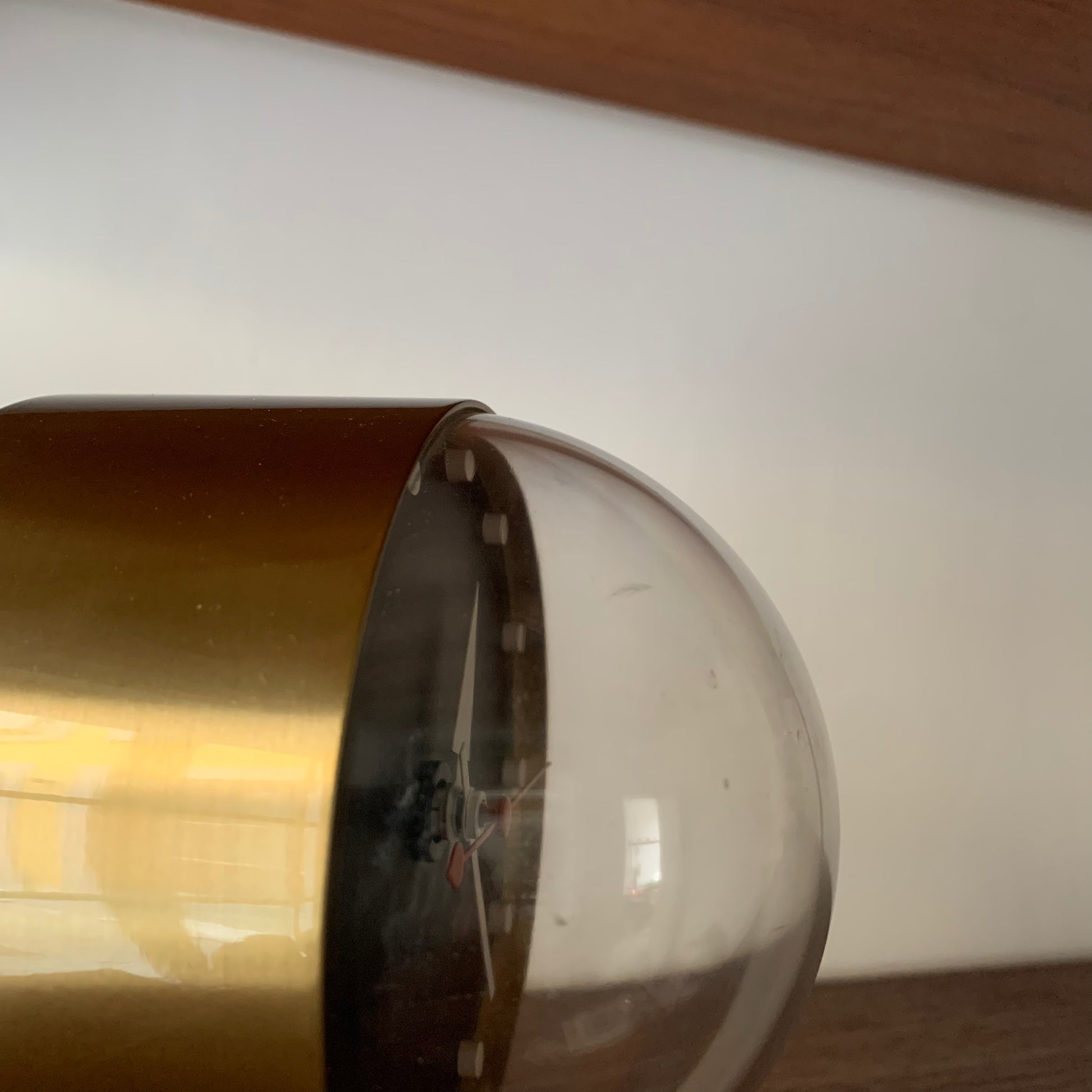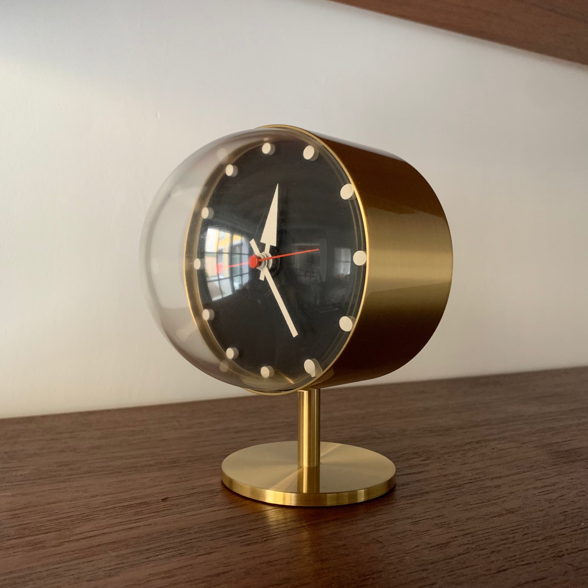 George Nelson table clock, model 4766 in brass, acrylic, enameled steel and enameled aluminum produced by Vitra c. 1999