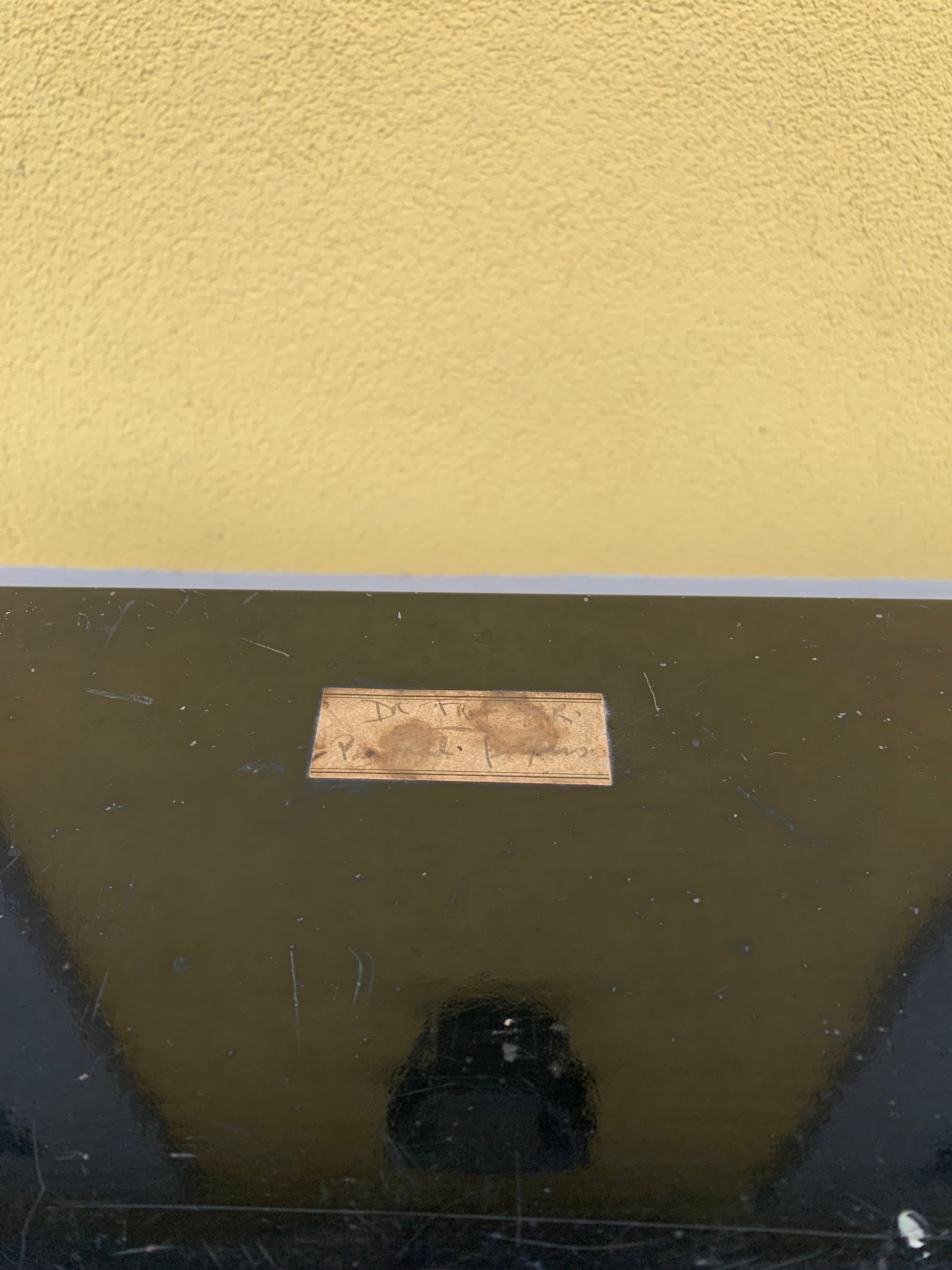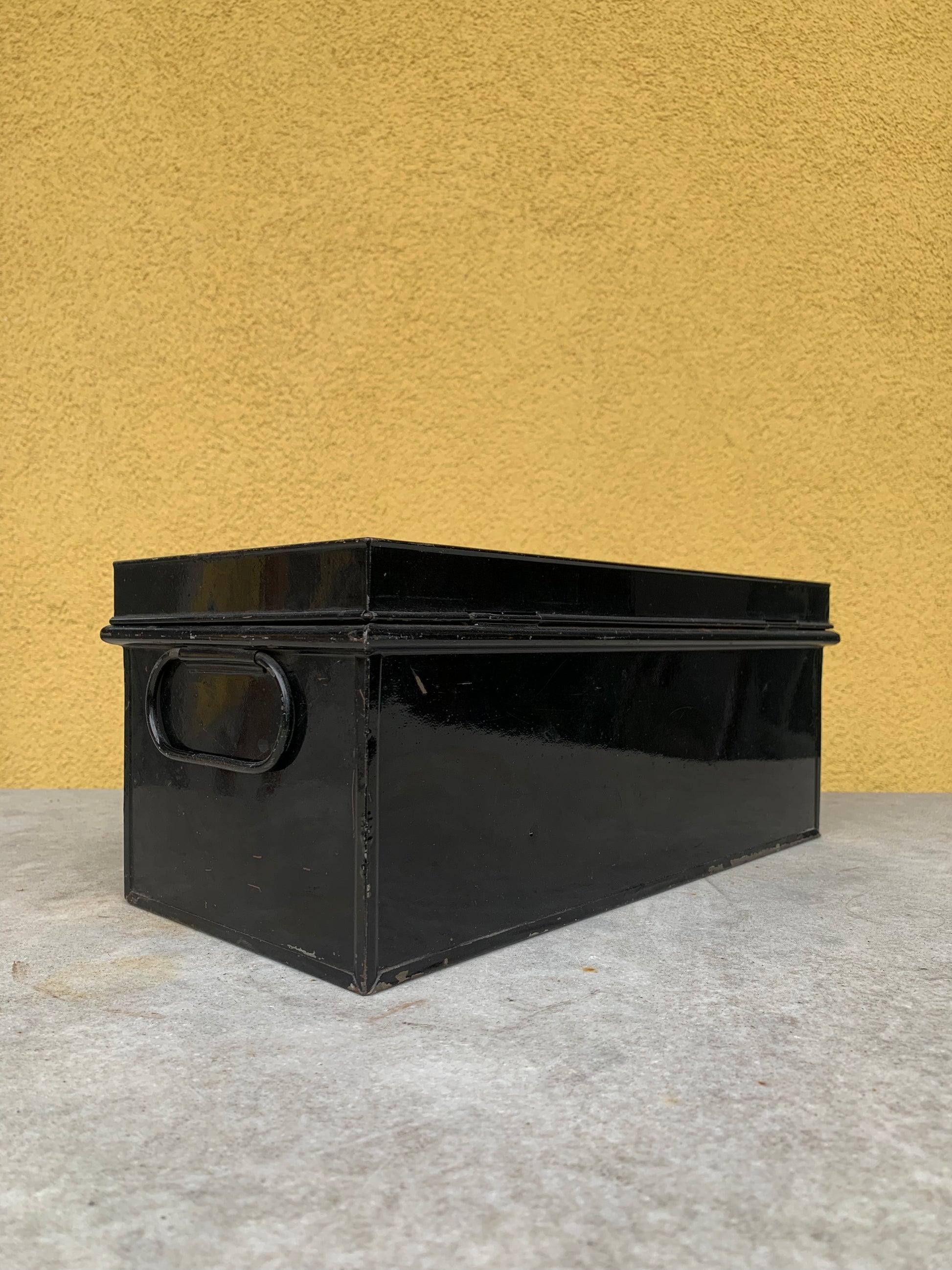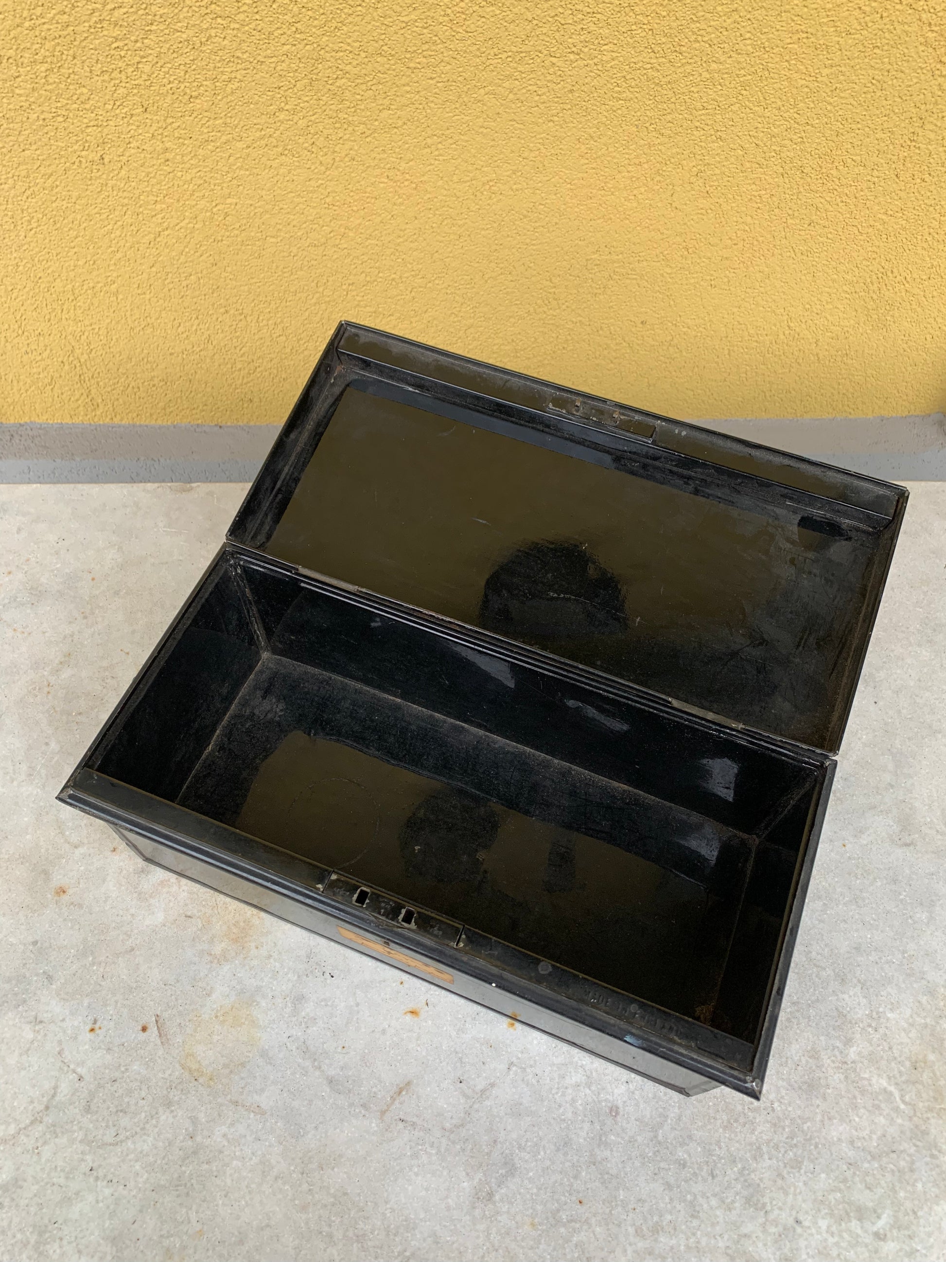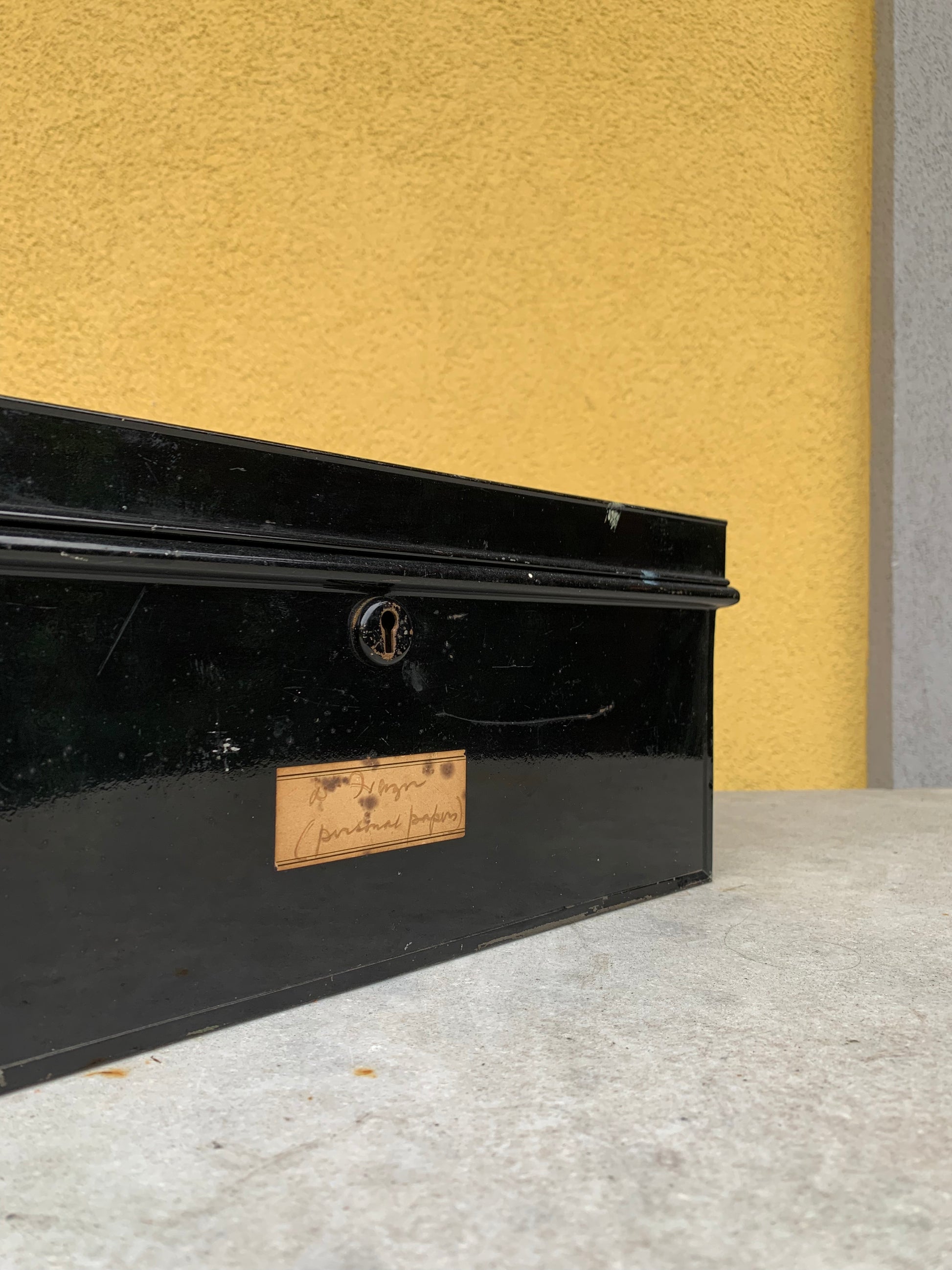 This elegant document box is crafted from black metal with a black painted finish. The lid features a decorative label that reads "Personal Papers". The key is missing.