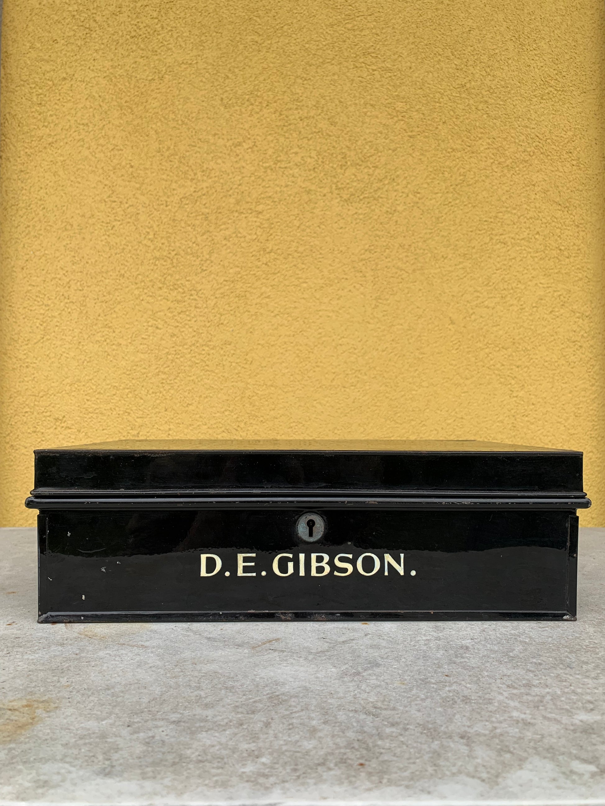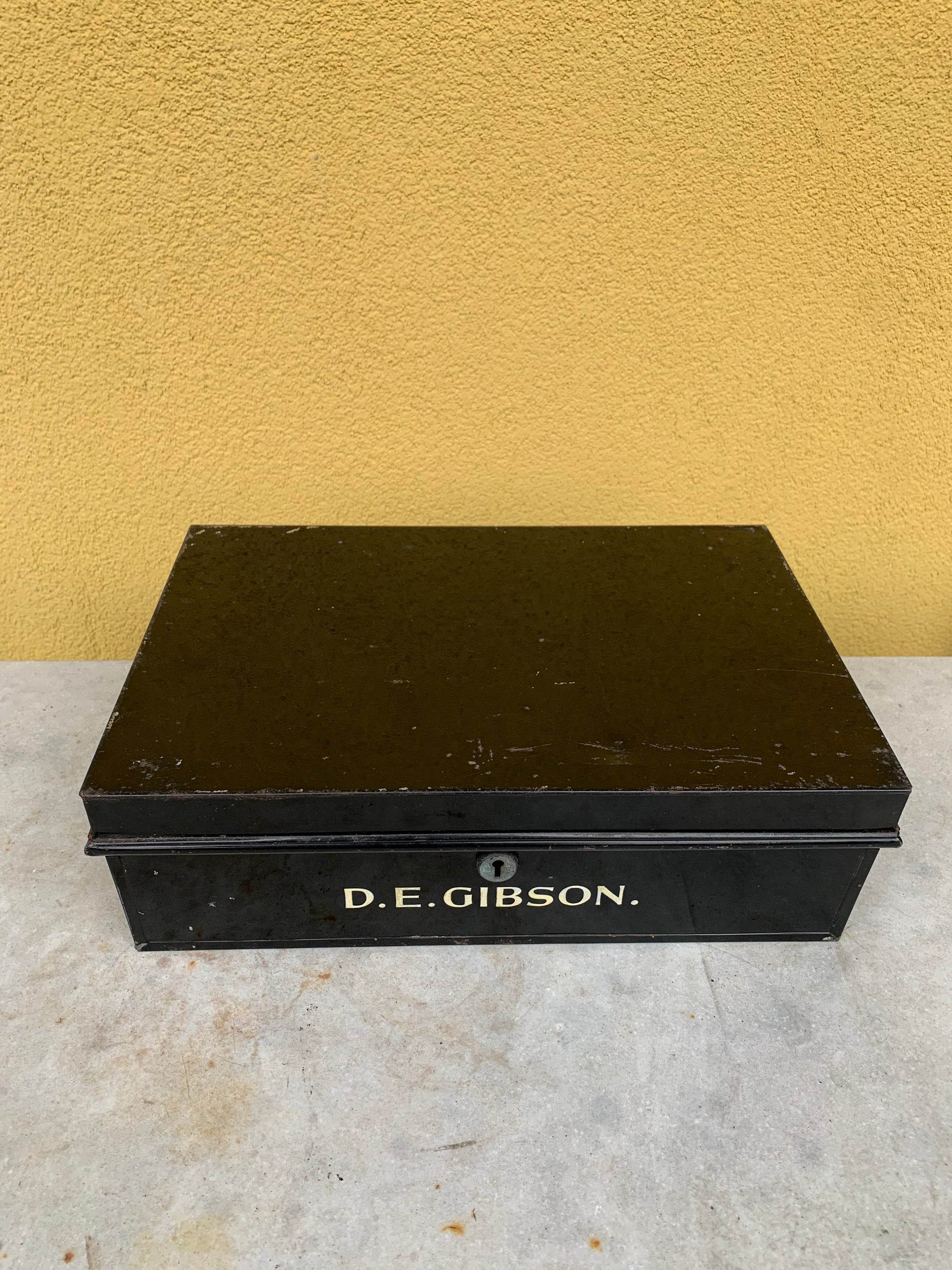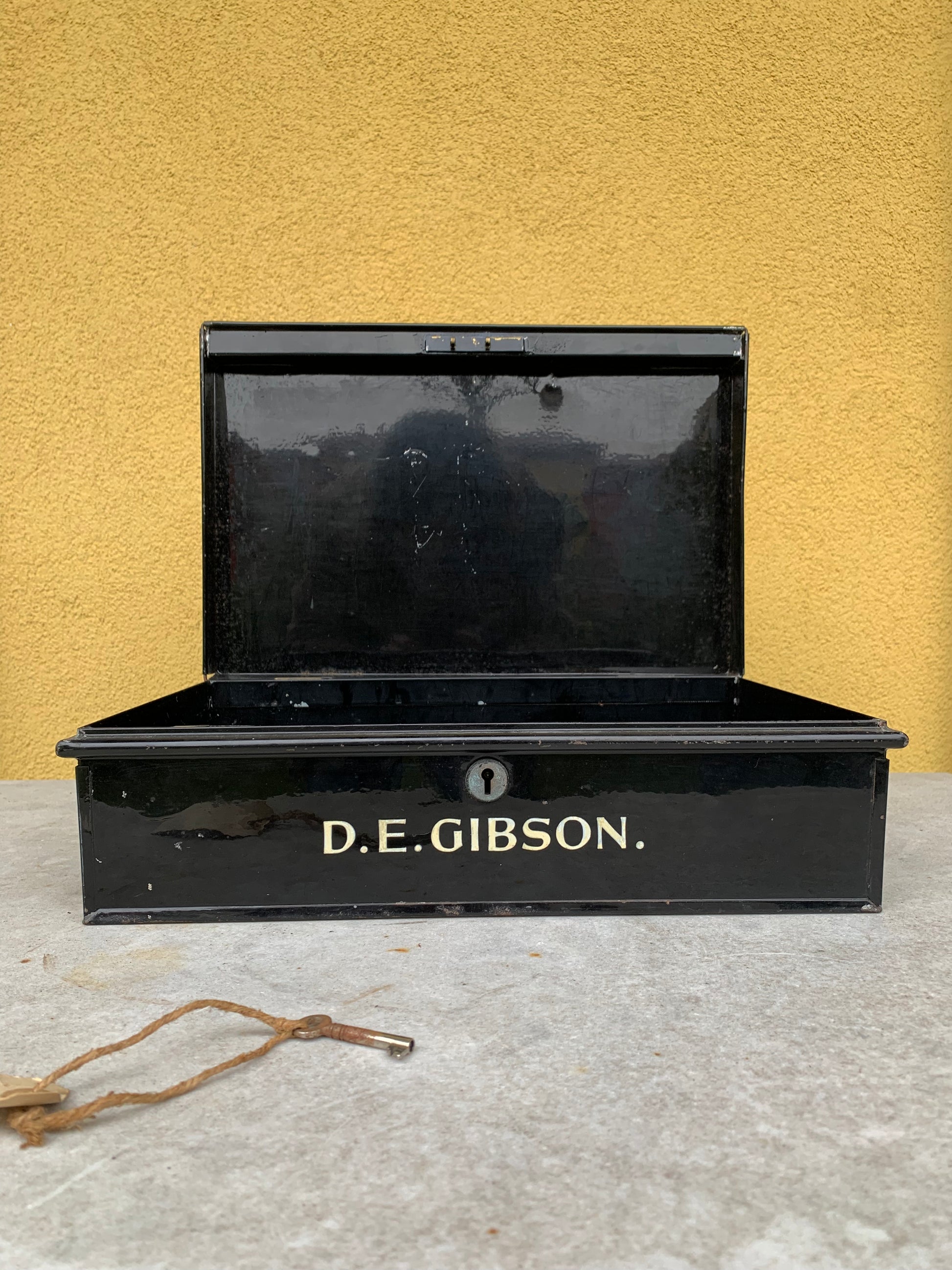 This elegant document box is crafted from black metal with a black painted finish. The lid features a decorative design that reads "D.E. Gibson". The original key provided enhances the authenticity of the piece, offering both aesthetic appeal and functionality.