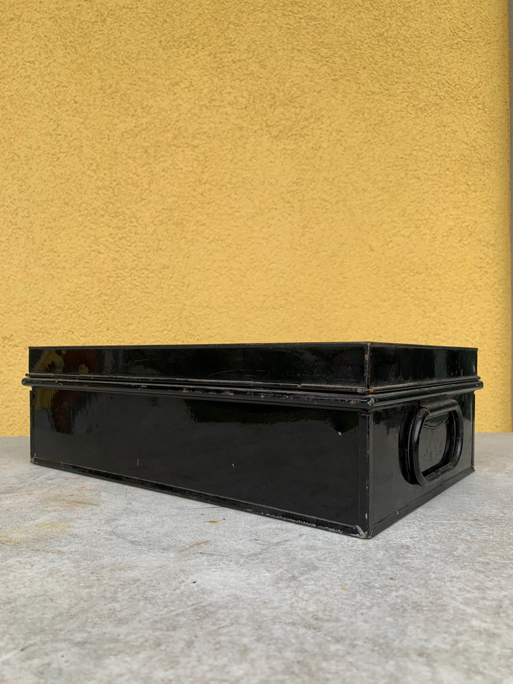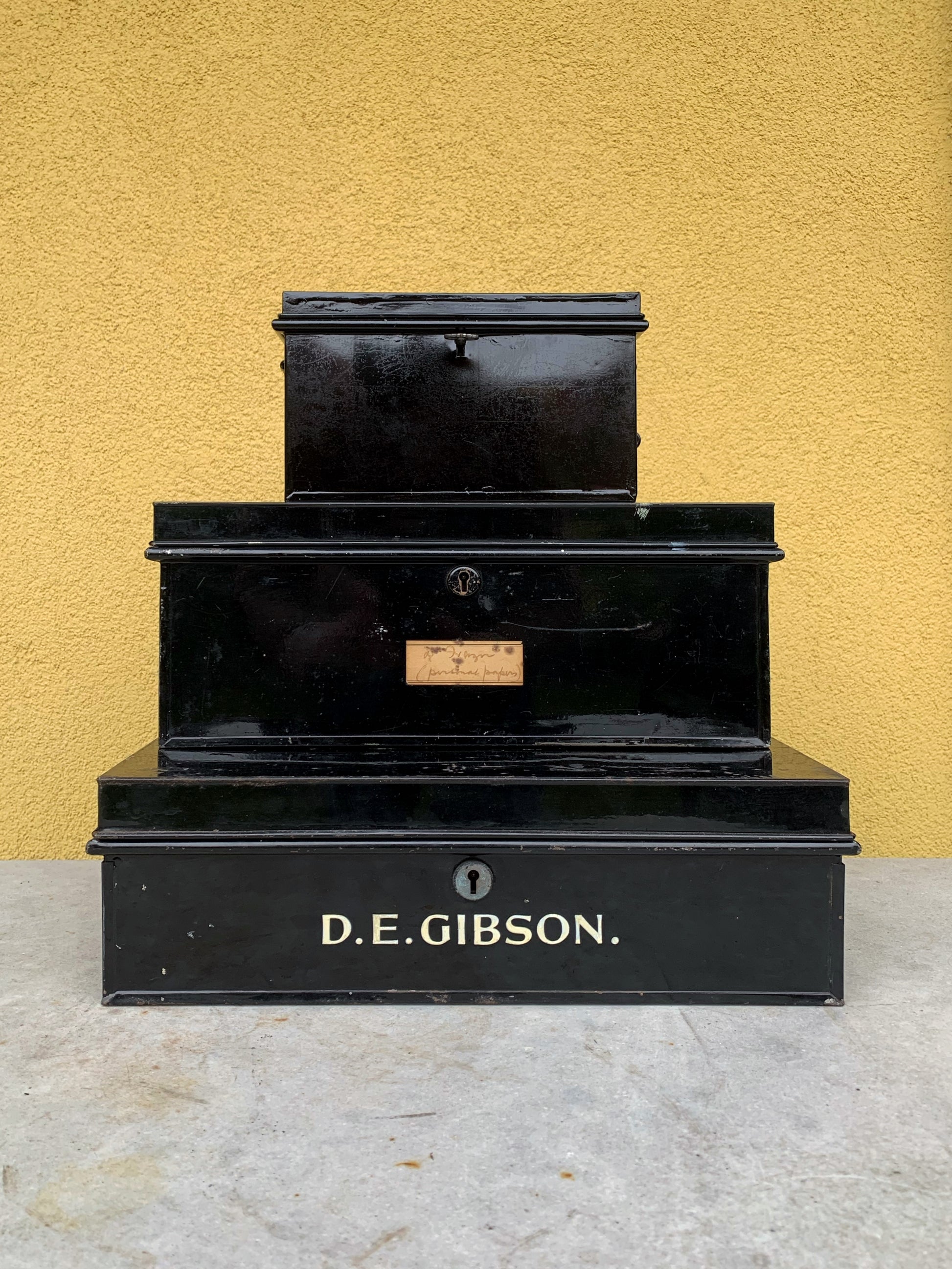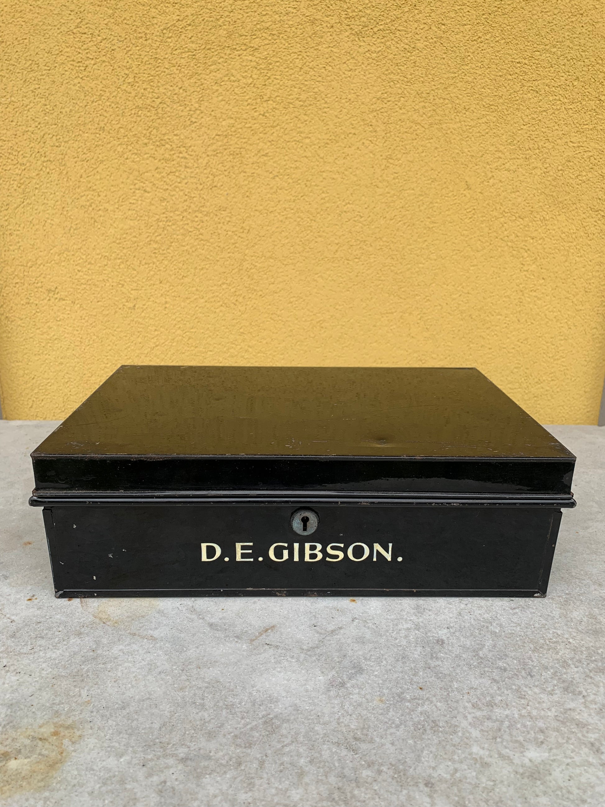 This elegant document box is crafted from black metal with a black painted finish. The lid features a decorative design that reads "D.E. Gibson". The original key provided enhances the authenticity of the piece, offering both aesthetic appeal and functionality.