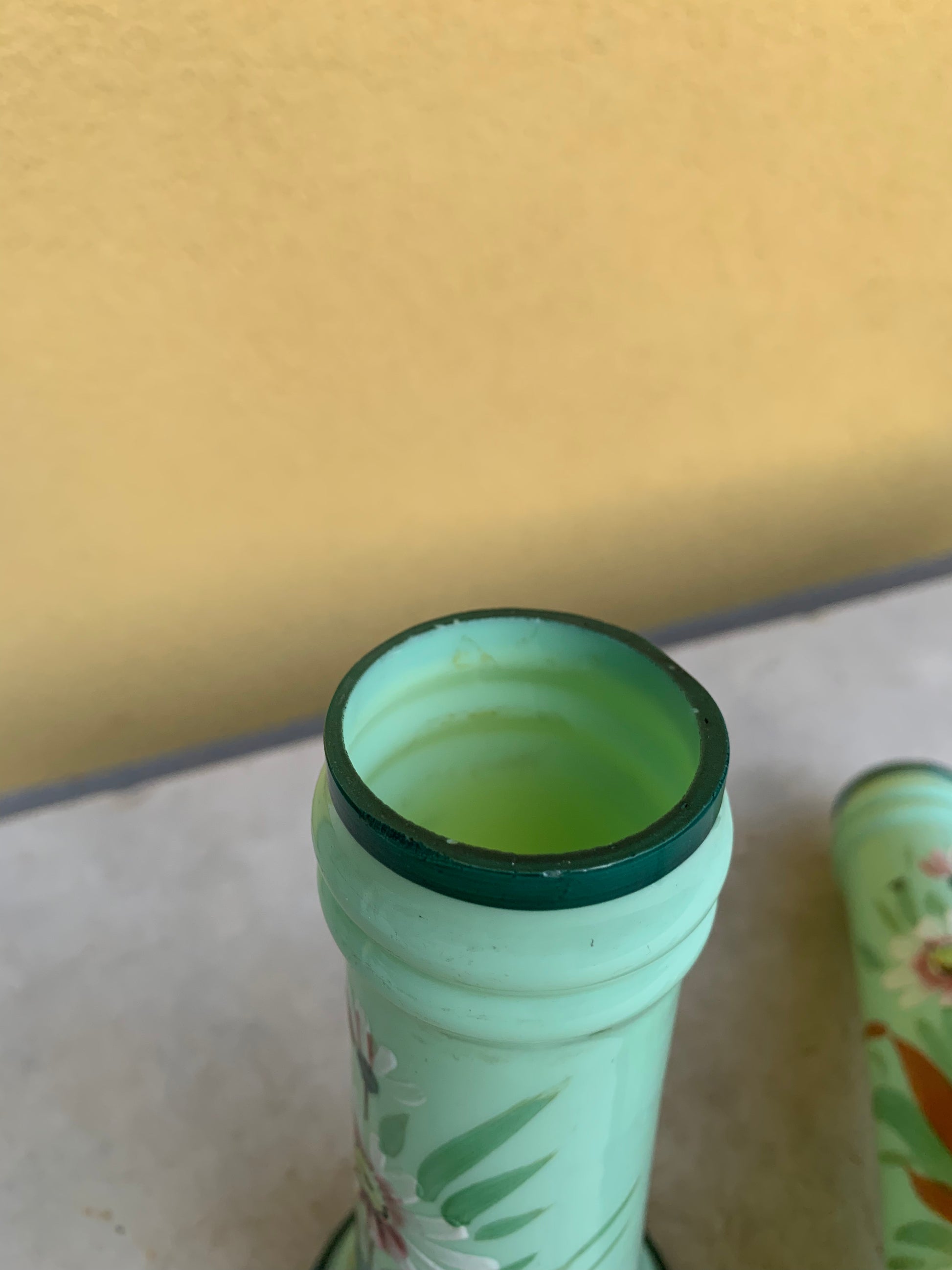 This beautiful set of two opaline vases from the end of the 19th century has a bold floral design that was painted by hand. They are perfect for displaying fresh flowers or as standalone decorative pieces.