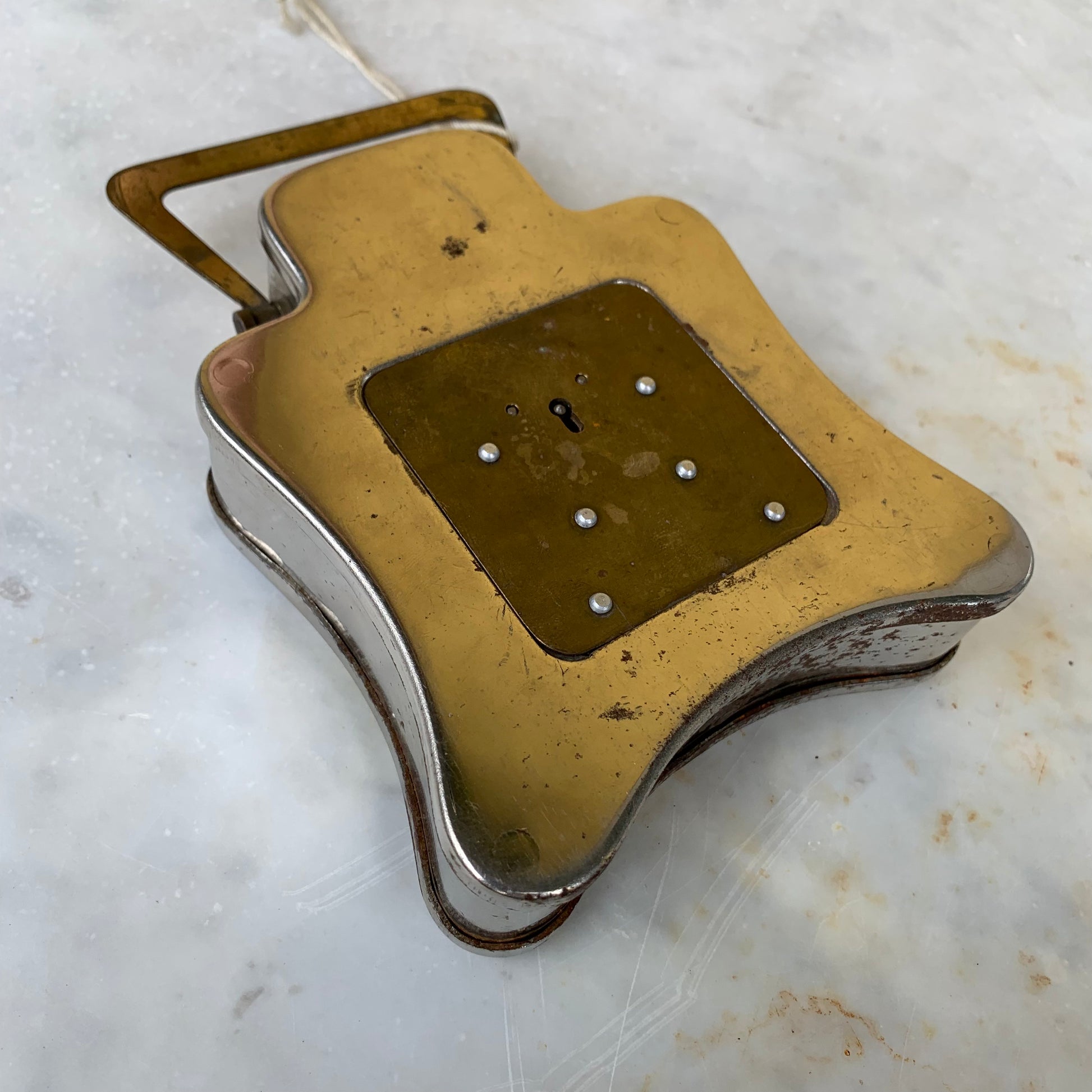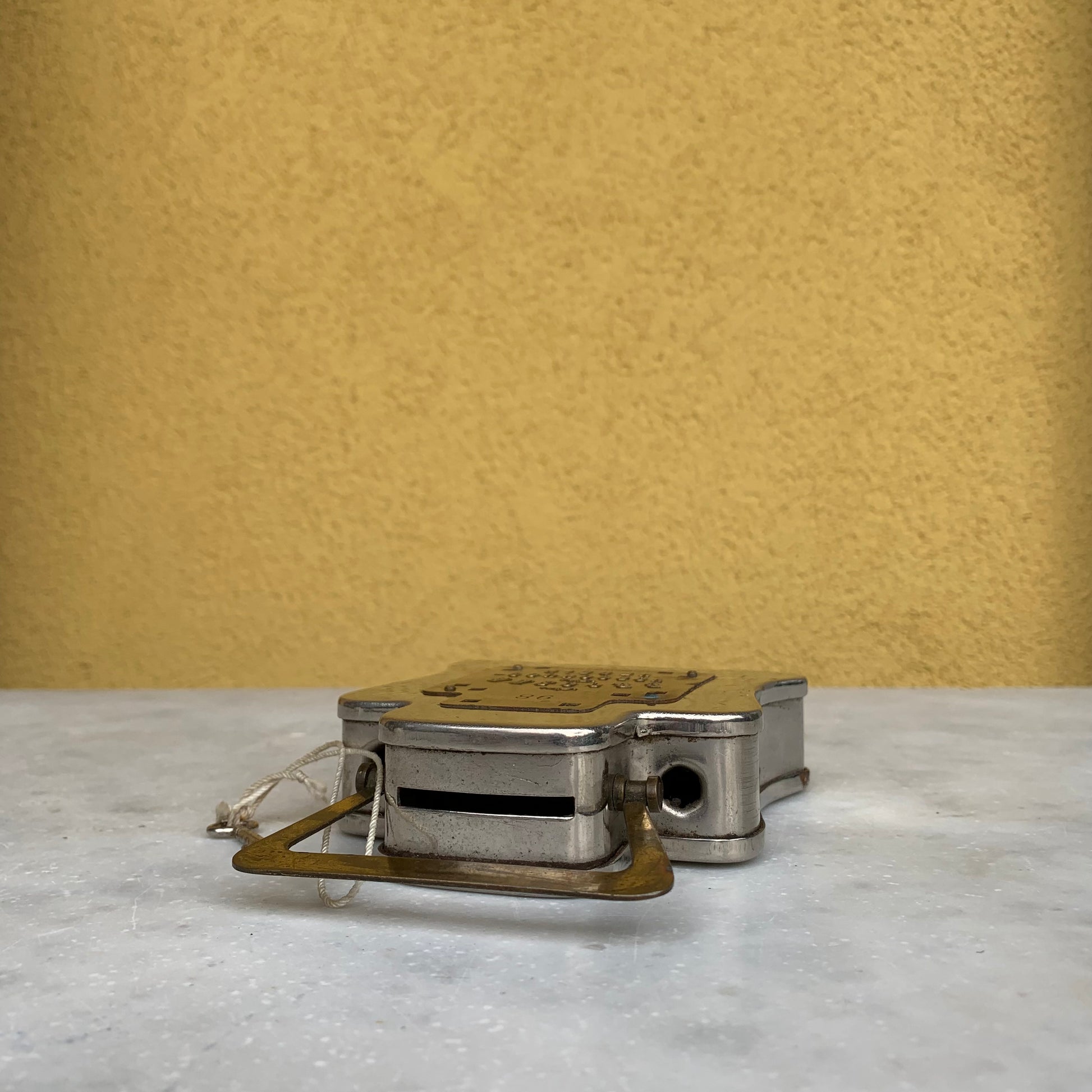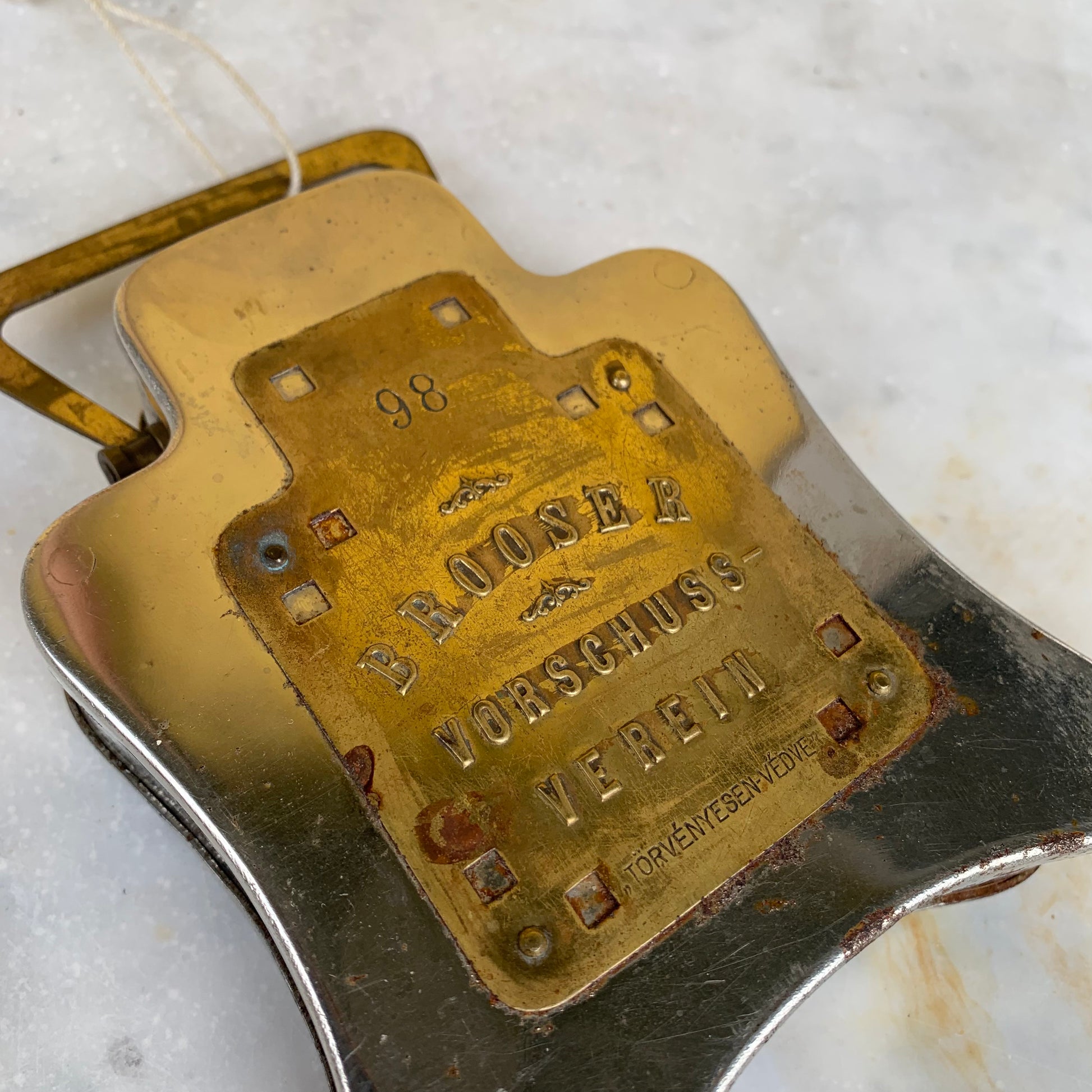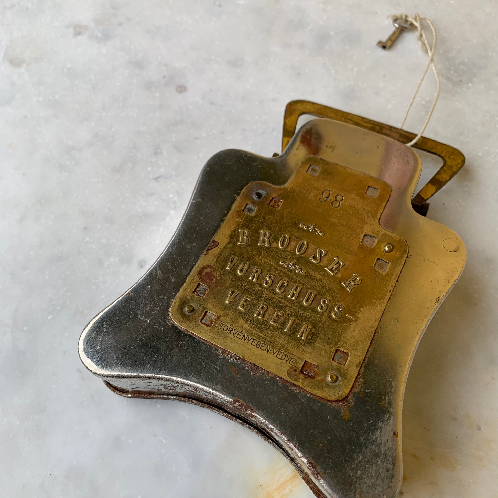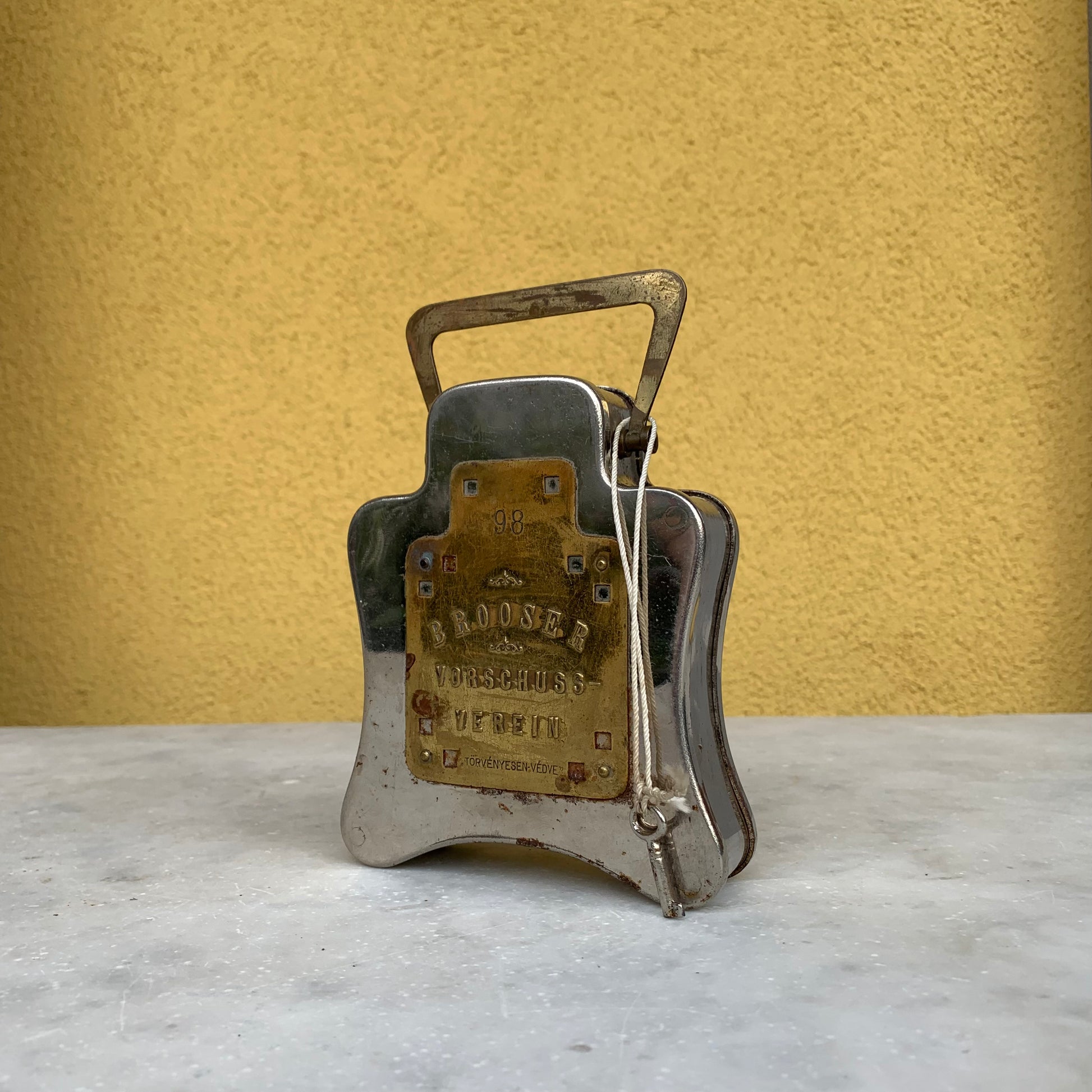 A piggy bank of the "Brooser Vorschussverein" from Hungary, from the end of the 19th century. Plaque with the embossed name of the savings bank and "étörvényesen-védve" (legally protected), movable handle, key included, functioning locking mechanism.